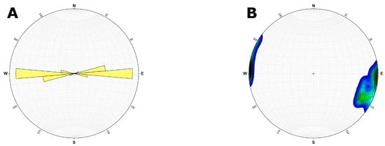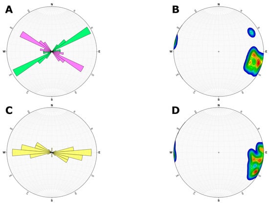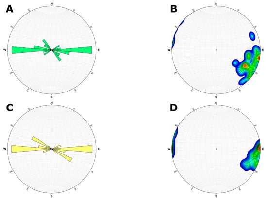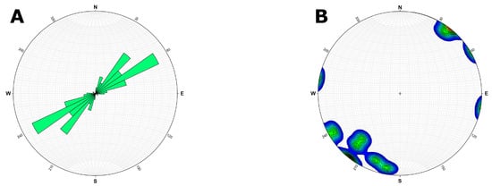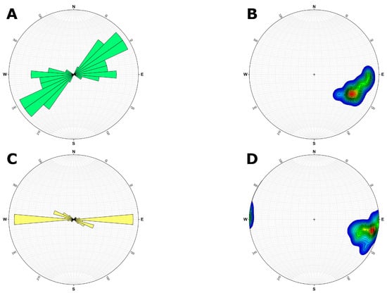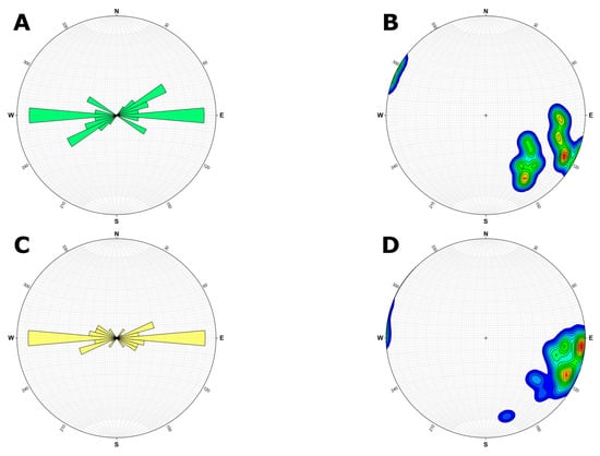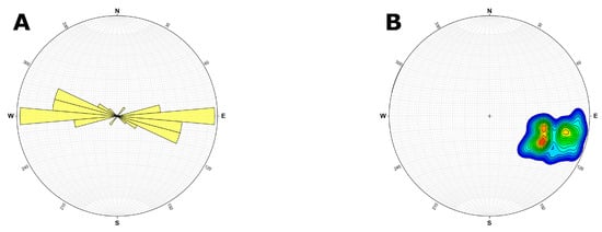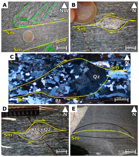 The shear zones are marked by a penetrative schistosity Sm with a W–E strike direction and vertical to oblique dip (Figure 10A). Several kinematic indicators are visible. The Lm shows an SE trend with a plunge to the SE (Figure 10B).