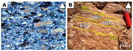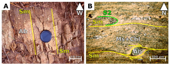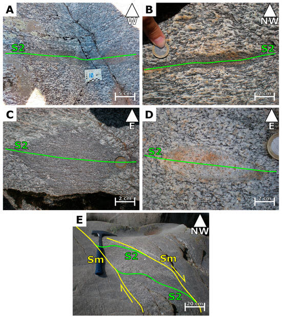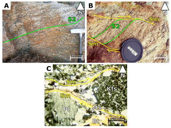 This complex exhibits a secondary penetrative regional foliation (S2; []). This foliation is characterized by the following mineralogical associations: (i) Qz + Pl + Bt + Ms + Ox; (ii) Qz + Pl + Grt + Bt + Ms + Ox; (iii) Qz + Pl + Cld ± Bt ± Grt ± Ms + Accessories + Ox. The S2 foliation show a consistent NE–SW strike (Figure 5A) and dips toward the SE. The mineralogical lineation (L2) identified on the S2 surface (Chl and Ms) plunges from horizontal to oblique (Figure 5B).