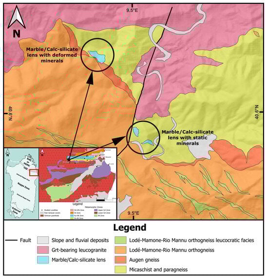 The southern marble/calc-silicate lenses are embedded within St-bearing micaschists and in proximity to two magmatic bodies: the Lodè-Mamone-Rio Mannu Orthogneiss (Ordovician; pre-Variscan) and the Punta Tepilora Granite (upper Carboniferous-Permian; late Variscan) (Figure 12). The marble/calc-silicate lenses can be classified as impure, given whether the amount of calcite and/or dolomite always less than 80% of the rock volume, and the presence of Grt and Ves, which confirm the presence of clay content. The mineralogical association consists of Wo + Grt ± Di ± Cal ± Qz ± Ves, which suggests that the protolith was a carbonate lens embedded in a pelitic sequence with scarce meta-siliciclastic and meta-volcanic horizons. The Grt (94% grossular) are slightly zoned. The Ves shows growth at the expense of the Grt.
