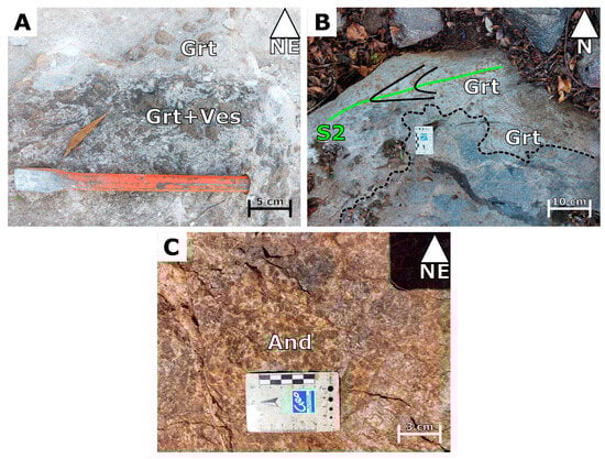In the Early Cambrian Bithia Formation, a Middle Ordovician granitic intrusion (478 ± 16–457 ± 0.17 Ma; [,]) is hosted by marly metasedimentary rocks that were affected by high-temperature (HT) metamorphism [,,]. Field data and relationships between HT/LP mineral assemblages in the metasedimentary rocks (Grt + Wo + Ves in carbonate lenses and And in pelites) demonstrate that the study area was affected by a polyphase HT overprint (I: T = 520–620 °C at XCO2 = 0.1, P: 0.2–0.4 GPa; and II: T = 600–670 °C at XCO2 = 0.1, P = 0.2–0.4 GPa) that pre-dates the Variscan tectonic, metamorphic, and igneous phases [].
