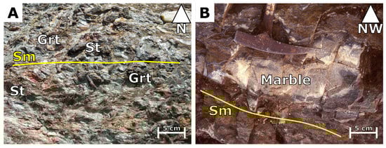 The Punta Gortomedda complex is characterized by micaschists (Figure 14A), paragneiss, quartzites, and gray marbles (Figure 14B). Micaschists are the most frequent lithotype; they appear shiny with both Grt and St centimetric in size.