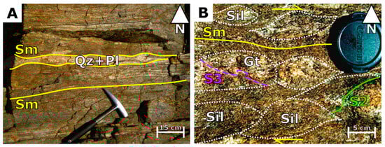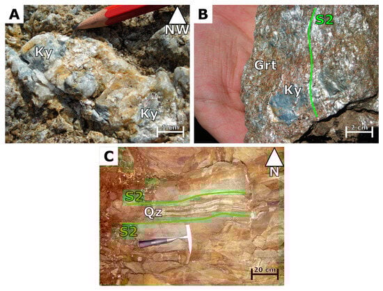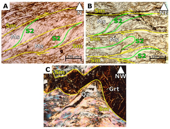 Related to S2, rare isoclinal folds with B2 axes are recognizable (Figure 6A), which are sub-orthogonal to L2, and their trend is E–W/NW–SE. Additionally, kinematic indicators associated with S2 can be identified, such as a top-to-right quartz sigma object. The S2 foliation was subsequently deformed by a later crenulation cleavage/open fold (Figure 6B,C) with axes trending in the E–W direction.