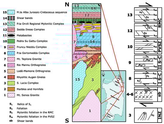 In this study, we re-evaluate the role and the timing of the Posada Valley Shear Zone (PVSZ; sensu []) within this broader geodynamic framework. Traditional interpretations have considered the Posada Valley Shear Zone as a part of the Posada Asinara Shear Zone (PASZ [,,,,,,,,]) and as the transitional boundary between the Internal Nappe Zone (INZ) and the High Grade Metamorphic Complex (HGMC [,,,,,,]) or the Regional Mylonitic Complex (RMC []). The Posada Asinara Shear Zone is considered 6 km thick in [] and 10–15 km thick in []. However, our findings suggest that the Posada Valley Shear Zone is confined to a narrower shear band characterized by transitions from mylonite I S-C to mylonite II S-C [,,] developed temporally between the East Variscan Shear Zone (EVSZ []) and the emplacement of Late Variscan granites [,,].