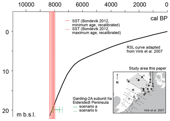 - Considering the entire chronostratigraphy obtained for core Garding-2(A), the age of the tsunami bed most probably coincides with the SST (Garding-2A scenarioa and scenariob: 8152–7632 cal BP and 8064–7424 cal BP compared to SST ages by [3]: minimum 8176–7941 cal BP, maximum 8346–8029 cal BP, (weighted) mean age 8172–8031 cal BP).