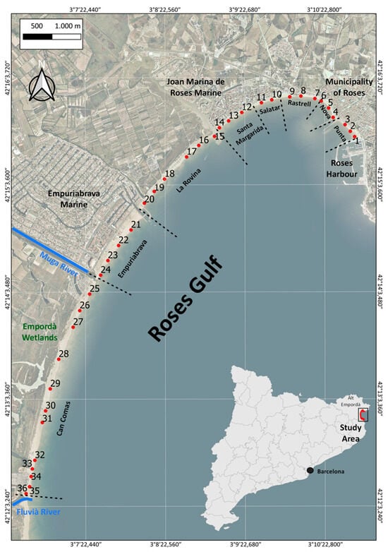 The Gulf of Roses is the largest and most extensive bay in the northeast of the Iberian Peninsula (Figure 1). Bounded by two rocky promontories, Cap de Creus to the north and the Montgrí massif to the south, it has a total coastline length of 25 km. These characteristics make the Gulf of Roses a typical embayed beach, between two rocky headlands that limit the flow of onshore–offshore and alongshore sediments [7].
