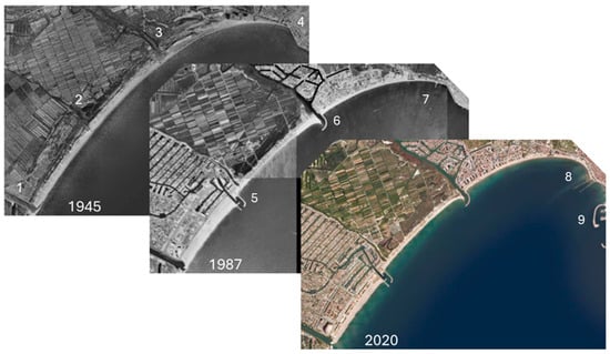 Historical evolution of the coastline of the study area. In the 1945 photo, a pristine condition of the beach–dune system is observed. Numbers indicate the mouths of the Muga River (1), the Salins Channel (2), the former Grau River (3), and the Ginjolers stream (4). In the 1987 photo, the presence of protection jetties at the entrances to the Marinas of Empuriabrava (5) and Santa Margarida (6) is observed, as well as the groin between the Nova and Rastrell beaches (7). Finally, in the 2020 orto-photomap, we observe the disappearance of the groin and the construction of jetties at the mouth of the Ginjolers stream (8), as well as the breakwaters of the Port of Roses (9).