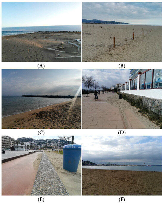 Representative views of the different beaches in the study area. (A) On the natural beach of Can Comes, you can observe the presence of nebkha-type dunes, originating from the presence of wooden logs deposited during storms. (B) Empuriabrava beach, marked to prevent the trampling of the embryonic dunes and to protect the nests of the Kentish plover (Charadrius alexandrinus). (C) The natural beach of La Rovina, shown from a southerly direction, where you can see the breakwater at the entrance to the Marina of Roses. (D,E) Urban beaches of El Ristrell and La Punta, respectively, where you can observe the accumulations of sand above the promenade, produced by wind transport. (F) View of La Punta beach in an easterly direction, where in the background, you can see the breakwater of the Port of Roses.