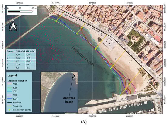 The DSAS 4.0 extension for ArcGIS [25] can be used to calculate the rates of variation and distances between different shorelines from transects. The operation of the extension is based on the following three steps: (1) define a reference line or baseline, from which the theoretical distances of the different annual positions of the shoreline will be calculated for the same transect, (2) digitize the shorelines for each of the years studied, and (3) establish the transects by statistical calculation. Statistically, the three main parameters that measure the evolution of the coastline are the NSM (Net Shoreline Movement); the EPR (End Point Rate), and the LRR (Linear Regression Rate). The NSM reports the distance between the oldest and youngest shorelines for each transect. The EPR is the annual rate of change in the position of two coastlines, i.e., the oldest and the most recent. It is a very useful method for coasts with a monotonous evolutionary behaviour and without significant changes in their trends, but it is rather limited for coasts with a dynamic behaviour since it does not allow for identifying inter-annual changes [25]. On the other hand, the LRR uses all available positions of the coasts within a time band. From these positions in the form of points, a linear regression line was created, whose slope is the evolutionary rate of that transect. See Figure 4A for an example of transect analysis for La Punta beach.