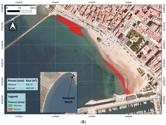 The quantitative analysis of the variations in the coastline during the period 2004–2020 was carried out using a Geographic Information System (GIS). The analysis was carried out using the following methodologies: (1) calculation by areas, forward and backwards, with the free software QGIS version 3.22, and (2) calculation of the rates of variation in the shoreline position by transect with the DSAS 4.0 extension (Digital Shoreline Analysis System) developed by the USGS [25] within ArcGIS ® v.9.2 software. In Figure 3, you will find the respective maps with the two types of analysis for each of the beaches studied.