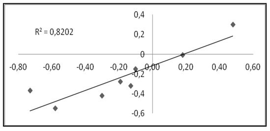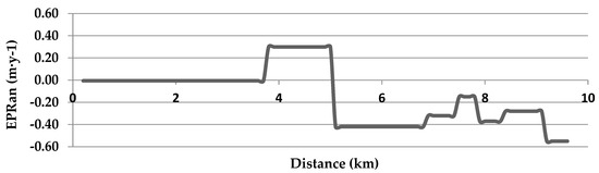 The EPRna values are comparable to the EPR values obtained from the transect analysis. Figure 7 shows the relationship between these two values with a strong correlation coefficient of 0.82. In addition, the position of the regression line indicates that the values obtained through the study of surface variations (EPRna) are slightly lower than those obtained through the transect analysis (EPR). The most significant difference between the two indicators is observed in Can Comes beach, where values of −0.006 and 0.18 are recorded for EPRna and EPR, respectively.