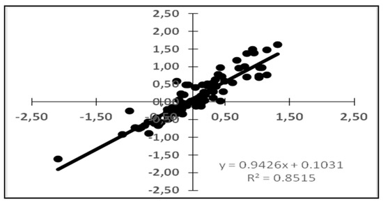 The remaining six beaches exhibit negative values for all parameters (Table 4). The average NSM values range from −9.21 for La Punta beach to −1.58 for Salatar beach. La Punta beach has the most negative values for EPR and LRR of −0.58 m·y−1 and −0.43 m·y−1, respectively. It is important to note that certain EPR values are more negative than LRR values, as observed in El Salatar, El Rastrell, La Punta, and La Nova beaches. Conversely, beaches like Can Comes, Empuriabrava, La Rovina, and Santa Margarida exhibit an inverse relationship between these two parameters. Dolan et al. [25] argue that LRR values are typically lower than EPR values, as LRR is influenced by outliers and encompasses all present values. Figure 5 shows the correlation between EPR and LRR values from the 97 studied transects. There is a linear relationship in the data with a correlation coefficient of 0.85. The equation of the line indicates that the LRR values are slightly lower than the EPR values.