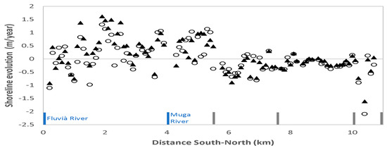 The study area exhibits a clear trend in EPR and LRR values from south to north (Figure 6), with predominantly positive values for Can Comes and Empuriabrava beaches that transition to negative values towards the north (La Rovina, Santa Margalida, El Salatar, El Rastrell, La Nova, and La Punta beaches). The boundary between these two sectors is delimited by the entrance to the Marina of Empuriabrava.