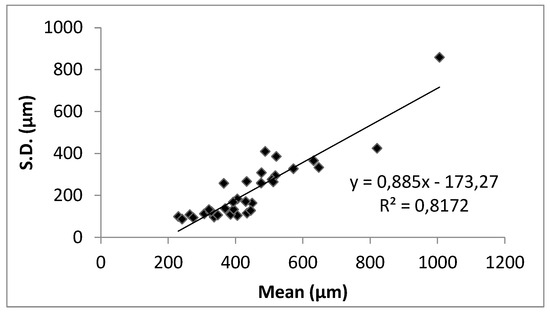 Relationship graph between the mean grain size, mean (x-axis), and the standard deviation, SD (y-axis), for the 36 samples from the wet beaches. The general trend implies better-sorted sediments for smaller grain sizes.