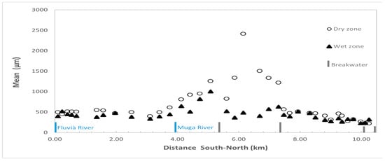 Considering the mean values (Table 5), we can quantify the impact of sediment transport toward the north on the variation in grain size. Evaluating the maximum and minimum values of grain size from the Empuriabrava and La Punta beaches, and calculating the distances between them, we find that sediments exhibit a rate of grain size decrease due to transport of 84 μm·km−1. On the dry beach, this rate increases to 234 μm·km−1.