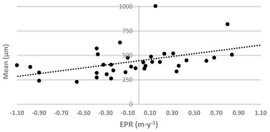 Graph of the relationship between grain size and the evolutionary trend in the coastline, represented by EPR (m·y−1). The regression line shows the general relationship trend between the two variables.