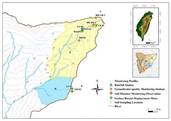 This study established two slope conceptual models, with the locations of monitoring stations and soil sampling sites shown in Figure 1. The A-A’ profile of zone A follows the profile line from BH-10CI to SW-01, BH-05CI, and BH-02, spanning approximately 200 m. The B-B’ profile for zone D extends from the upper part of SW-02 down the slope, covering approximately 100 m.