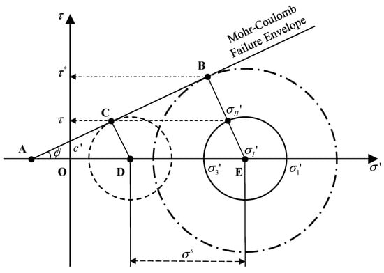 The Local Factor of Safety (LFS) is a metric used to evaluate the stability of slopes by comparing the shear strength of the soil to the actual shear stress at a given point. This concept, based on the Mohr–Coulomb failure criterion, describes the process of stress state changes toward failure in soil due to rainfall []. According to this theory, the current stress state of the soil is represented by a Mohr circle, which indicates the shear stress and normal stress at a point. As rainfall increases soil water content, effective stress decreases, causing the Mohr circle to shift leftward. The size of the Mohr circle remains largely unchanged during this shift, as it is primarily influenced by the slope geometry and self-weight of the soil. The strength of the soil can be estimated by the intercept between the Mohr circle and the Mohr–Coulomb failure envelope. This intercept defines the Local Factor of Safety (LFS), representing the ratio of shear strength to shear stress at any point within the slope, as illustrated in Figure 2. Therefore, the Local Factor of Safety (LFS) for any point can be derived from the similarity of triangles ACD and ABE, illustrating that the LFS assessment is applicable beyond just circular failure surfaces and can accommodate various slope geometries.