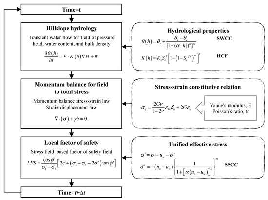 This study uses the finite element analysis model HYDRUS-2D along with the Slope Cube Module to compute one-way coupled variably saturated flow and stress problems. By simulating variably saturated flow—a process characterized by fluctuations in soil water content due to rainfall—and the associated mechanical stresses, we gain insights into how these factors may contribute to potential slope failures. The stability of the slopes is evaluated using the Local Factor of Safety (LFS) derived from these simulations. The model, developed and validated by Lu et al. [], follows the analysis process shown in Figure 3. Through the transient unsaturated flow solution, the changes in soil water content, suction head, and moist unit weight over time are determined. The two-dimensional flow control equation, based on Richards’ equation [], is expressed as a transient unsaturated flow solution developed by Šimůnek et al. [] and is represented as follows: