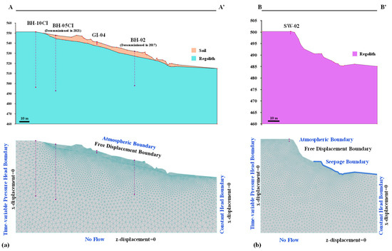 For zone D, due to the lack of hydrogeological data, the conceptual model is based on the exposed weathered bedrock, as shown in Figure 4b. Similarly, mesh refinement is applied to the surface layer, resulting in an overall mesh with 2786 nodes and 5570 elements. The hydrological boundary conditions are set as follows: the slope surface is an atmospheric boundary, which facilitates the consideration of rainfall infiltration and evaporation. A seepage boundary is established at a location where seepage was observed, positioned 50 m horizontally from the slope surface. The right side is maintained as a constant head boundary to represent stable groundwater conditions, while the left side is treated as a time-varying head boundary, accommodating fluctuations in groundwater levels associated with rainfall events. Lastly, the bottom boundary is set as a no-flow boundary, simulating an impermeable layer that restricts water movement. The mechanical boundary conditions are similarly structured, with the slope surface treated as a free displacement boundary to permit natural soil movement. The left and right are defined as zero displacement boundaries in the x-direction, and the bottom serves as a zero displacement boundary in the z-direction.