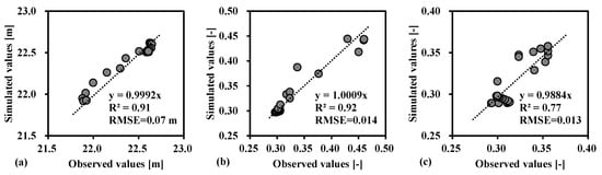 Results of simulated and observed values for (a) groundwater level in zone A, (b) soil water content in zone A, and (c) soil water content in zone D.