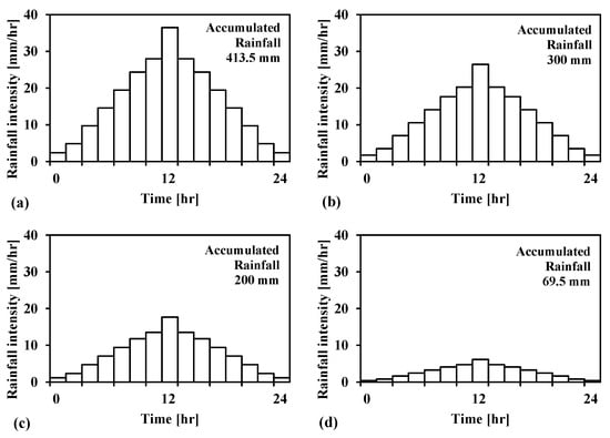 Four hypothetical rainfall scenarios: (a) extreme intensity, (b) high intensity, (c) moderate intensity, and (d) low intensity.