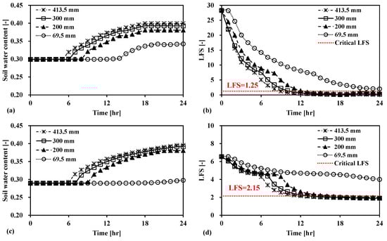 Simulation results for (a) soil water content in zone A, (b) LFS in zone A, (c) soil water content in zone D, and (d) LFS in zone D.