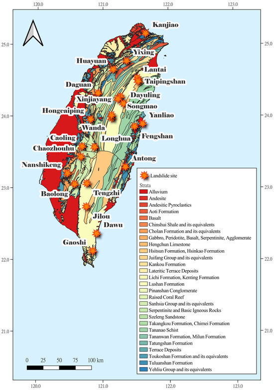 Upon reviewing the existing landslide investigation projects in Taiwan, it was found that the most extensive one was managed by the Geological Survey and Mining Management Agency (GSMMA). From 2007 to 2013 [25,26,27,28,29,30,31], the GSMMA implemented a project entitled “Investigation and Evaluation of Hydrogeological Impacts on Slope Stability in Watersheds across Taiwan”. This project mainly focused on investigating and assessing hydrogeological impacts on slope stability in major watersheds across Taiwan. It aimed to strengthen field hydrogeological investigations in order to determine the extent of hydrogeological impacts on landslide occurrence. Furthermore, it conducted research on the correlation between landslides and related factors. The project targeted deep-seated landslide areas within major northern, central, southern, and eastern Taiwan watersheds. A total of 24 landslide sites as shown in Figure 1 were selected for investigation, experimentation, monitoring, and analysis in order to determine how infiltration during rainfall alters hydrogeological conditions, leading to a potential trend of recurring rockslides. At each landslide site, three geological boreholes were drilled with depths ranging from 50 to 80 m, and geological descriptions were prepared based on core samples.