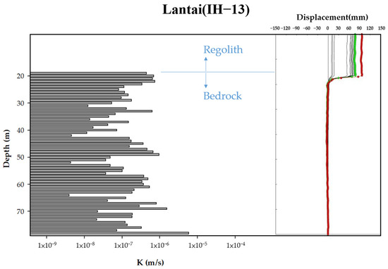 To determine if the landslides in this study follow patterns similar to those identified in previous research, comparisons can be made by cross-referencing existing inclinometer data that displays distinct deformation and hydraulic conductivity profiles. Upon reviewing the inclinometer monitoring data from the 24 landslide sites, it was observed that 14 of them have clear records of sliding. These sites include the Caoling, Wanda, Yixing, Songmao, Xinjiayang, Longhua, Hongcaiping, Wushe, Huayuan, Baolong, Lantai, Kanjiao, Taipingshan, and Dayuling landslide sites. Therefore, the inclinometer data from the 14 sites were overlaid with the hydraulic conductivity distribution charts estimated by the HCPI model. Upon comparison, it was observed that for 12 inclinometer boreholes, there were clear interfaces of significant changes in hydraulic conductivity values corresponding to sliding depths. Figure 7 exemplifies the comparison results for the Longhua landslide site. The interrupted red line of Figure 7, showing significant differences in hydraulic conductivity values above and below the depth of 44 m, coincides precisely with the sliding depth recorded by the inclinometer. The segment above a depth of 44 m also exhibited higher permeability than the segment below. Overall, the average hydraulic conductivity value differed by two orders of magnitude. The average hydraulic conductivity values in the upper segments were greater than 10−6 m/s, indicating potential groundwater accumulation at the interface, leading to increased pore water pressure and decreased slope stability.