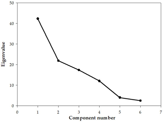 This section presents the analysis results of calculating the weight values for each factor using PCA. First, the varimax method was used for axis rotation, and more influential factors were extracted based on principal components with eigenvalues greater than 1, aided by a scree plot to determine the number of components to extract (as shown in Figure 3). The analysis was performed with a cumulative contribution ratio of over 80%.