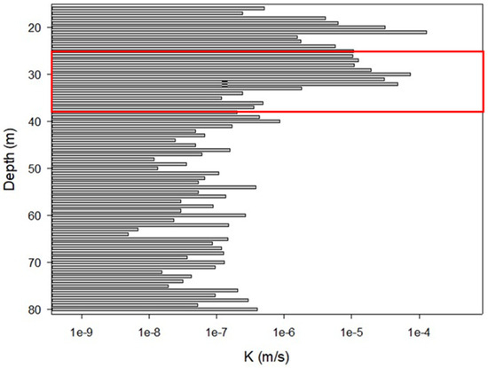 An abrupt changing zone (the red rectangle in the figure) for the hydraulic conductivity profile at the depths between 34 m and 36 m (an example of the Wanda landslide site).