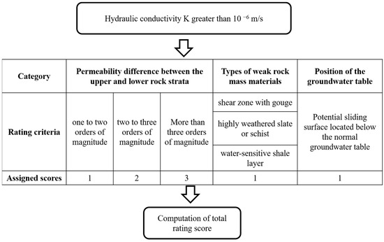 Groundwater can induce weak layers in the strata to become sliding surfaces [32,33]. Therefore, if the potential sliding surface is located below the normal groundwater table, it is assigned a weighted score of one point.