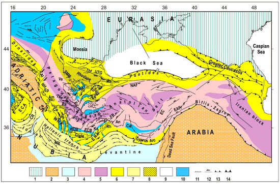 149. Barka, A.A.; Reilinger, R. Active tectonics of the eastern Mediterranean region: Deduced from GPS, neotectonic and seismicity data. Ann. Geofis. 1997, 40, 587–610. [Google Scholar] [CrossRef]