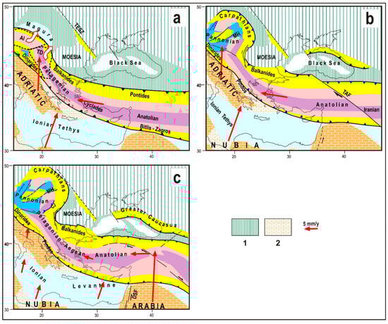 Figure 2. Proposed evolutionary reconstruction of the central–eastern Mediterranean region. (a) Late Oligocene. The Eurasian and African domains are separated by the Tethyan belt, formed by an inner core (ophiolitic and metamorphic units, pink and violet, respectively), flanked by orogenic belts of European and African affinity (yellow). Al = Alcapa block, TD = Tisza-Dacia block, TESZ = Trans European Suture Zone (separating the European deformed sector from the East European Craton, [43]). (b) Early Miocene. Stressed by the Arabian indenter, the Tethyan belt migrates NW wards, at the expense of the oceanic and the thinned continental domains in the Magura zone. MH = Middle Hungarian fault, TAF = Trans Anatolian fault system. (c) Middle-Late Miocene. DSF = Dead Sea Fault. (1) Thinned continental Eurasian domain, (2) thinned continental Nubia/Adriatic domain. The kinematics with respect to a Eurasian reference frame [23,44] is tentatively indicated by the red arrows (scale in the inset). Present geographical contours (thin black lines) are reported for reference. Other colors and symbols as in Figure 1.