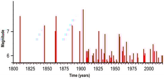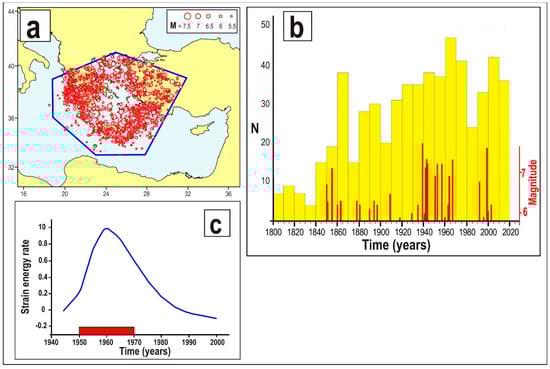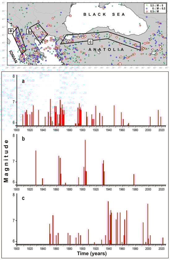Figure 4. Time patterns of main earthquakes that occurred in the Epirus thrust zone (a), the Serbo–Macedonian massif (b) and NAF (c) zones since 1800. The geometries of the zones considered are shown on the map. Seismicity data by [104,105,106,107,108,109,110,111,112,113,114,115,116].