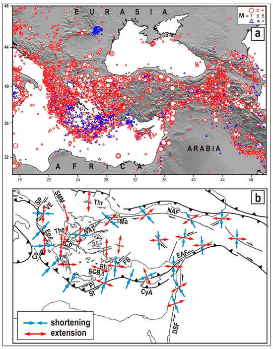 Figure 5. (a) Major earthquakes (M > 5) that occurred since 1600 A.D. Seismicity data as in Figure 4 and by [117,118,119,120,121,122,123,124]. (b) Strain fields in the main seismic zones inferred from focal mechanisms and geological data (See the references in the text). Abbreviations as in Figure 1.