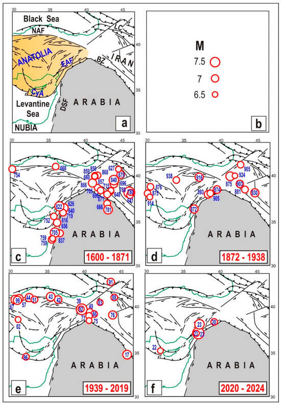 Driven by the spreading of the Red Sea and the Aden gulf, the Arabian plate tries to move roughly northward. This motion is accommodated by shortening processes at the collision zone with Eurasia. At the northeastern front (Zagros), the shortening is accommodated by underthrusting, uplift and lateral escape of masses in a relatively wide zone (e.g., [164,165]). At the northwestern front, the shortening is accommodated by uplift and the westward escape of the Anatolian wedge. The decoupling of Arabia from Nubia is mainly allowed by strong earthquakes along the Dead Sea Fault (DSF). The activities in the above seismic zones are connected to each other, as the decoupling earthquakes in one fault zone may increase stress at the other, still blocked, faults. To tentatively evaluate the reliability of this hypothesis, we have considered the distribution of major earthquakes that have occurred since 1600 in the northern Arabian and eastern Anatolian (EAF and NAF) zones (Figure 8). To evidence the main seismic phases at the above fault systems, we have considered four time intervals (Figure 8c–f).