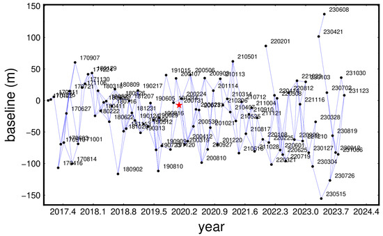 Temporal and spatial baseline distribution plot for the second set of SAR images. The horizontal axis represents the acquisition time of the radar images, with the numbers after the decimal point indicating a decimal division of the year for greater precision.