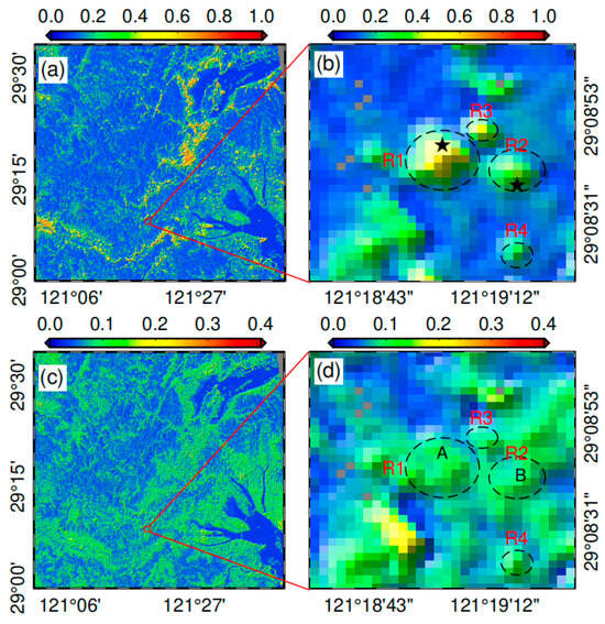 Stacking coherence coefficient and standard deviation after weighted averaging. (a) Coherence coefficient map for SAR image interferograms of Ninghai County and surrounding areas; (b) coherence coefficient map for regions including the Nanshanzhang and Liufeng landslides in Nanling Village; (c,d) standard deviations of the weighted averages for the corresponding areas. The pentagrams in the figure indicate the positions of sliding masses identified through field geological surveys. In panel (d), the locations marked A and B represent the core deformation areas identified through field geological surveys and InSAR observations and were thus designated as feature points for subsequent deformation extraction.