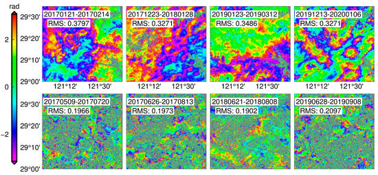 The statistical parameters of coherence for the interferograms are shown in Figure 4. It is evident that the coherence coefficients of SAR image interferograms exhibited significant seasonal variations, with the root-mean-square (RMS) displaying the most pronounced seasonal amplitude changes. Interferograms derived from summer SAR images generally have lower RMS, standard deviation, and mean coherence values, indicating weaker coherence and higher observation noise in the deformation field. In contrast, interferograms from winter SAR images show higher coherence, reflecting reduced observation noise in the deformation field. To investigate the impact of these coherence statistical parameters on deformation observation, interferograms with relatively high and low coherence, as shown in Figure 4, were analyzed. The statistical parameters are presented in Figure 5. Interferograms from winter and spring exhibit a coherence RMS above 0.35, indicating robust overall coherence. Conversely, interferograms from summer and autumn display a coherence RMS around 0.2, reflecting substantial decorrelation in most areas. This decorrelation leads to significant observation noise in the deformation field and unreliable surface deformation measurements, thereby introducing considerable errors in the final time-series deformation calculations.
