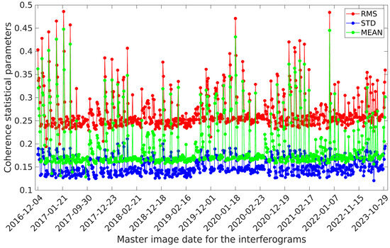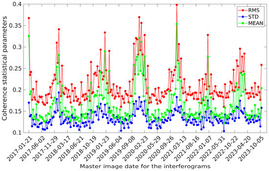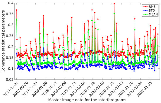 By applying the stacking technique to process the coherence coefficients of all interferograms during phase unwrapping, errors due to temporal and spatial decorrelation were weakened. However, during the summer, the study area experiences vigorous vegetation growth and significant atmospheric turbulence, resulting in considerable observational noise in interferograms derived from summer SAR images compared with those from the winter. To evaluate the impact of SAR image coherence on deformation observation noise in the study area, a statistical analysis of the coherence across all interferograms was conducted. The root-mean-square, standard deviation, and mean of the coherence coefficients for each interferogram were calculated using the following formulas: