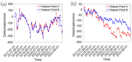 Based on this analysis, the root-mean-square (RMS) was used as the primary criterion for assessing observation noise in the deformation field. Interferograms with a coherence RMS below a specific threshold were excluded from the final deformation calculations. By testing various thresholds and analyzing deformation trends at feature points in the study area, it was determined that interferograms with a coherence RMS below 0.226 should be excluded for time-series deformation calculations using SBAS technology. To evaluate the effectiveness of the error correction, the accumulated deformation at feature points in the study area is presented in Figure 6, with feature points A and B indicated as shown in Figure 3. Figure 6a shows excessive deformation fluctuations and periodic uplift deformation, inconsistent with the sliding mass movement characteristics found in the field geological survey. After reducing the observation noise caused by low-coherence interferograms, Figure 6b shows that, although the residual sum of squares of the fitted accumulated deformation curve is smaller than that in Figure 6a, there are still significant fluctuations and observation noise inconsistent with the actual deformation characteristics of the sliding masses, indicating that the observation accuracy remains relatively low.