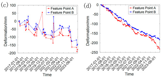 Cumulative deformation of characteristic points in the study area. (a) Time-series deformation at feature points for the first dataset; (b) time-series deformation at feature points for the first dataset after removing interferograms with high noise, based on a coherence RMS threshold; (c) time-series deformation at feature points for the second dataset; (d) time-series deformation at feature points for the third dataset.