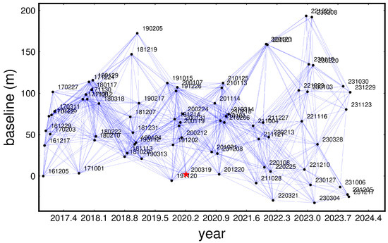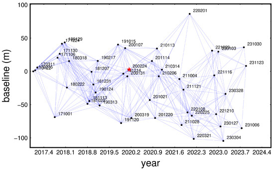 In processing the data, an initial selection of 100 SAR images with a 24-day interval was made, resulting in a temporal baseline of 75 days (the SAR data information is shown in Table S1). This configuration ensured that each intermediate SAR image could be interfered with the four adjacent images, both preceding and following, thereby satisfying the critical temporal baseline requirements for interferometry. A total of 228 interferograms were generated, with their temporal and spatial baselines illustrated in Figure 2. In the figure, the red pentagons indicate the master images used during image registration in the preprocessing phase.