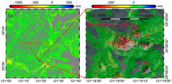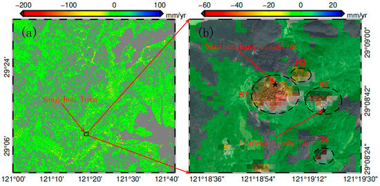 Cumulative surface deformation along the line of sight (LOS) in the study area. (a) Cumulative surface deformation in the LOS in Ninghai County; (b) Cumulative surface deformation in the LOS in the research area of Sangzhou Town.