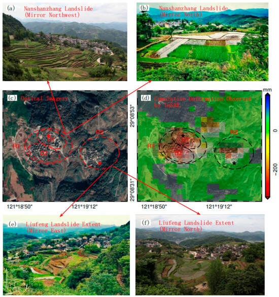 Deformation and geomorphological characteristics of Nanzhang landslide and Liufeng landslide. (a) On-site topography from the field geological survey of the potential landslide at Nanshanzhang (mirror NW); (b) On-site topography from the field geological survey of the potential landslide at Nanshanzhang (mirror N); (c) Optical image of the study area; (d) Cumulative surface deformation of the study area; (e) On-site topography from the field geological survey of the potential landslide at Liufeng (mirror E); (f) On-site topography from the field geological survey of the potential landslide at Liufeng (mirror N).
