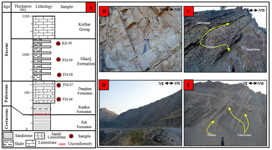 (A) Simplified lithological log of the studied section. (B–E) Key lithological variations in the studied formations are shown by field photographs taken along the main road. (B) Coarse sandstone of the Dunghan Formation. (C) Photograph of the Dunghan Formation shows limestone, shale, and sandstone units. (D) Shale interbedded with limestone and sandstone in the Ghazij Formation. (E) Close view of the outcrop showing shale and limestone interbeds of the Ghazij Formation.