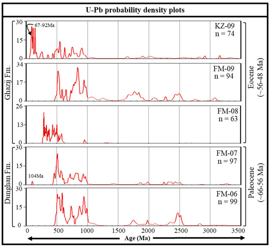 The U-Pb age data of the Dunghan and Ghazij formations are displayed as probability density plots (PDPs). The x-axis represents the age and the y-axis represents the number of zircon grains.