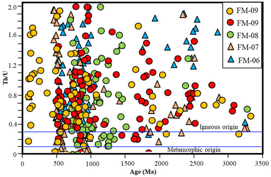 The two-dimensional binary plot displays the Th/U ratio and detrital zircons U-Pb ages. The Th/U ratio values above 0.3 represent igneous origin, while below 0.1 indicates metamorphic origin.