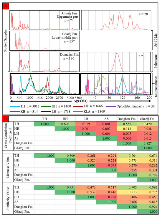 (A) Comparison of the U-Pb ages of the Cenozoic sequence exposed in the Fort Munro section with the source terranes. (B) Quantitative analyses of the Cenozoic sequence with possible source terranes. Values between 0 and 1 reflect a no-to-perfect relationship. The green to red color variation reflect perfect to no relationship.