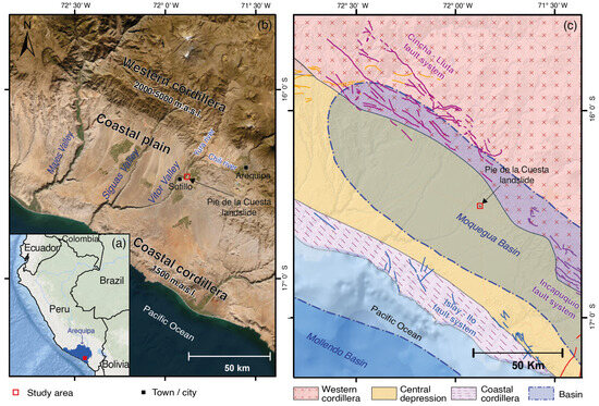 The Pie de la Cuesta landslide is located on the hydrological left flank of the Vitor River Valley in the Arequipa region, Southern Peru (Figure 1a), approximately 34 km to the west–southwest (WSW) of the city of Arequipa (Figure 1b). The Vitor River Valley has a northeast–southwest orientation, and resulted from the confluence of the Yura River and the Chili River valleys. Both valleys originate in the western foothills of the Peruvian Andes (Figure 1b) and flow towards the Pacific Ocean, incising up to 600 m canyons at the location of the landslide, in the Coastal cordillera (Figure 1b). The coastal cordillera is formed by the uplifting sedimentary fill of the Moquegua basin of the Cenozoic age [6] (Figure 1c). The Vitor River has a flow rate of 4 cubic meters per second during the dry season and increases to 50 to 100 cubic meters per second during the rainy season (from January to March).